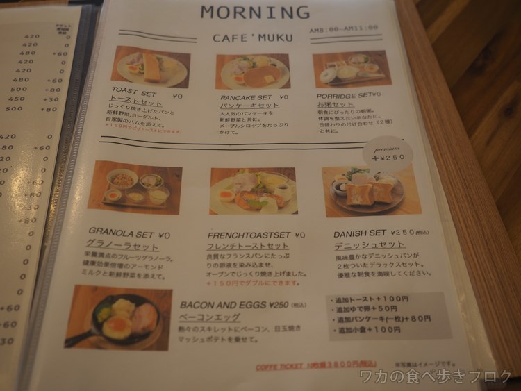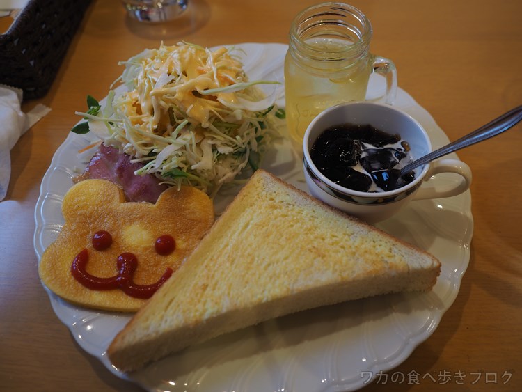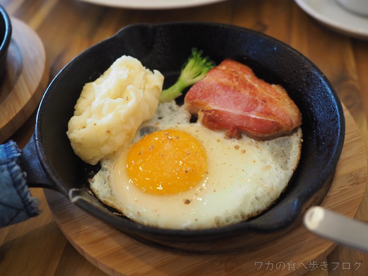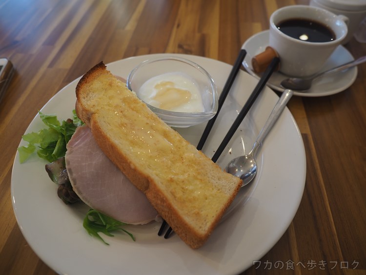 通常のモーニングに追加少し払うと、さらに鉄板ベーコンエッグとか