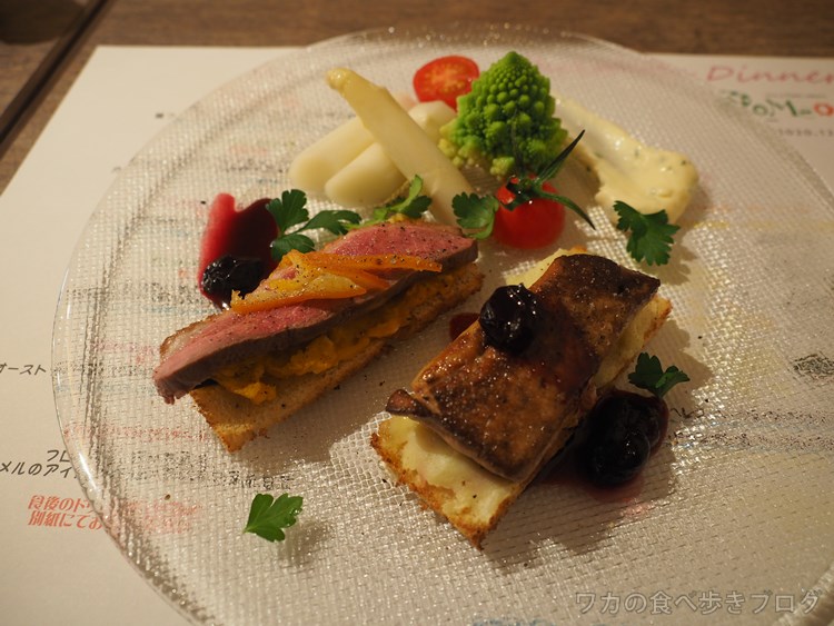 1品目は鴨のフィレ肉とフォアグラの自家製フォカッチャでオープンサンド