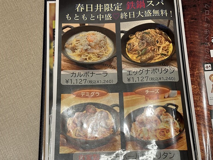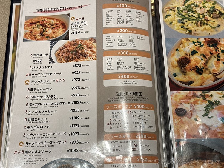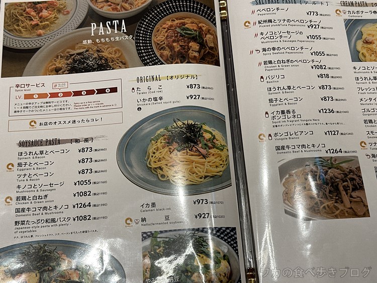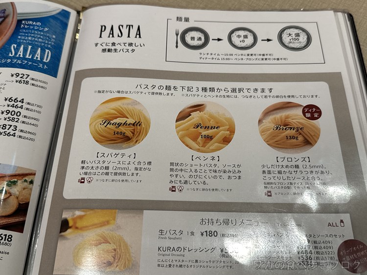 麺は生パスタ、普通盛り、中盛り無料で、大盛り100円