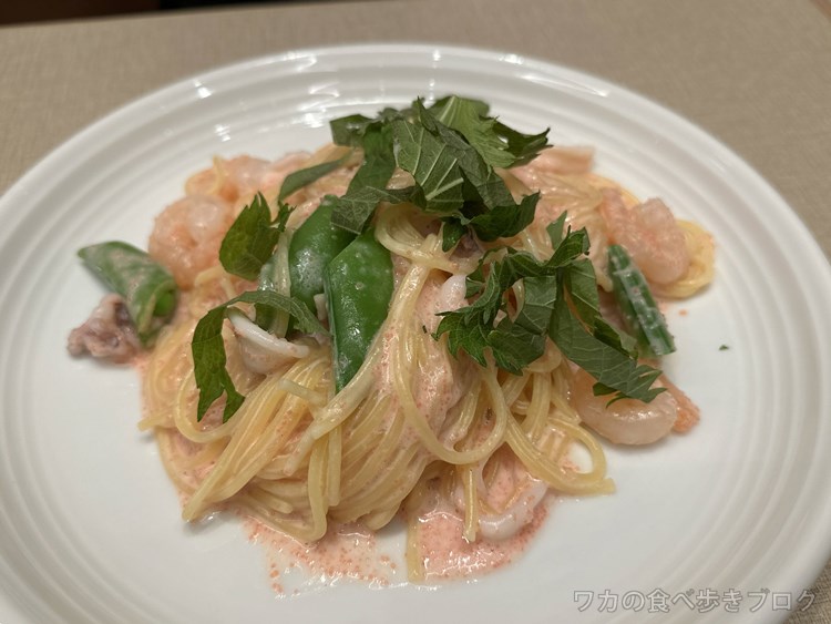 ヤリイカ小海老エンドウの明太クリームスパ(麺スパゲティ)1218円 中盛り