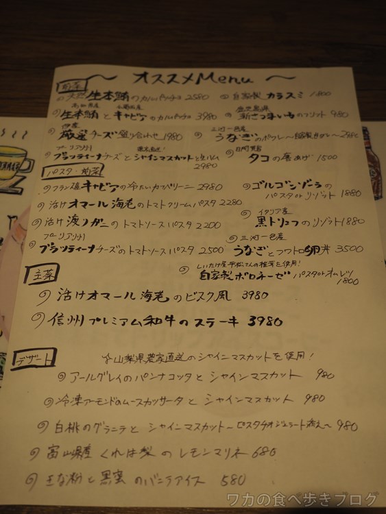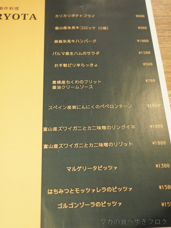 メニュー 一品物、前菜、パスタ、ピザ、リゾット、メインと色々