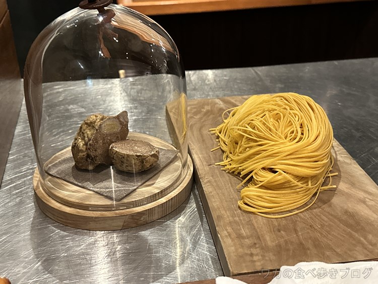 細麺にしっかり卵黄ソースが絡む、そして白トリュフがホワッと!