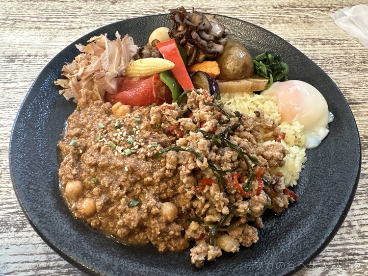 連れはキーマカレーを。 野菜1100円 台湾ミンチ390円 温泉玉子260円