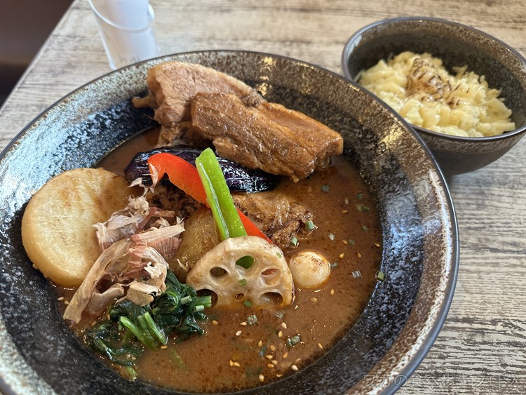 スープカレー チキンレッグ1200円 +角煮390円 いももち120円 炙りチーズ120円
