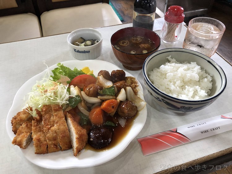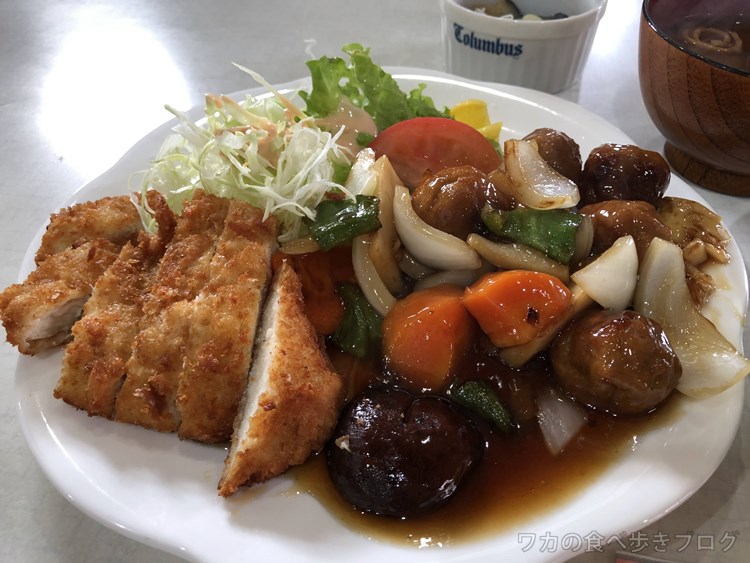 チキンカツ、肉団子酢豚、ご飯、茄子、味噌汁