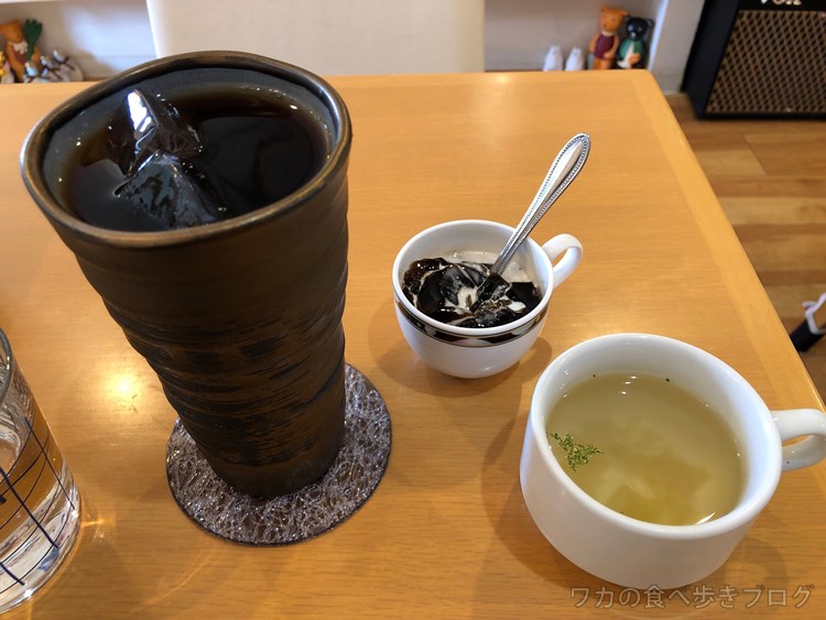 あっさりとしたスープにアイスコーヒー、コーヒーゼリー