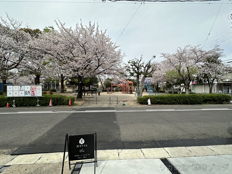 桜の満開な天王公園の向かえ、