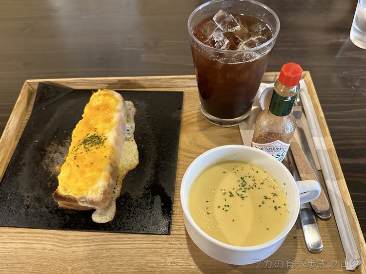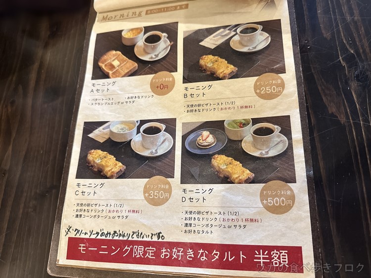 モーニングでは鉄板ピザトーストと、タルトのセットがあるんですが