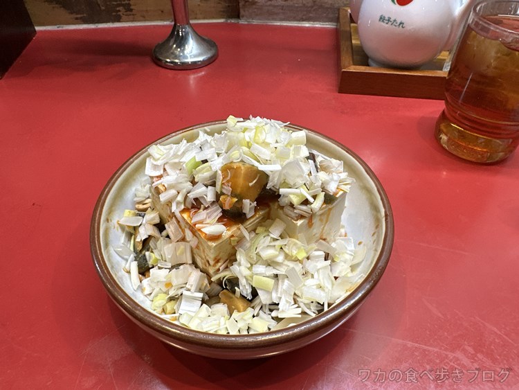 お豆腐にたっぷりのねぎ、ピータンとピリ辛ダレ