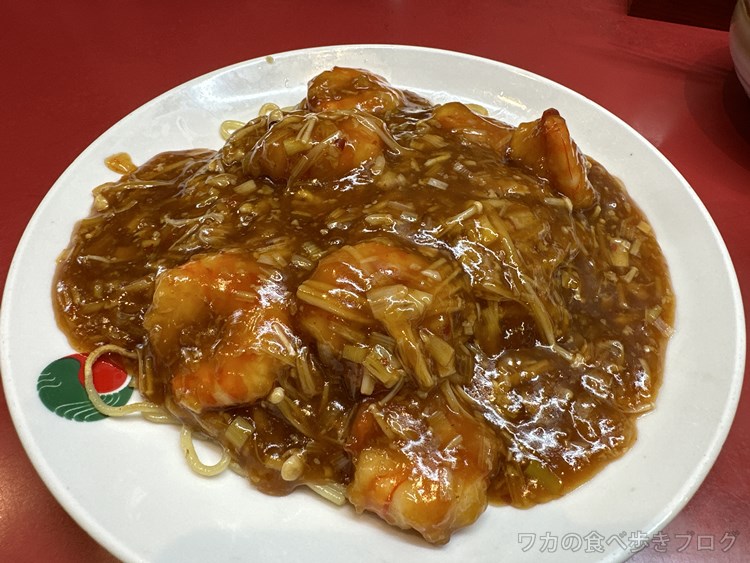普通にあんかけ焼きそばっぽいけど大きい海老がゴロッゴロ入ってて食べ応え抜群♪