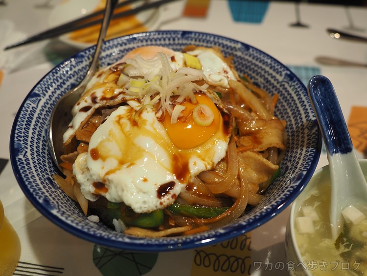 野菜炒め(少し肉入り)がご飯にONされてる丼。