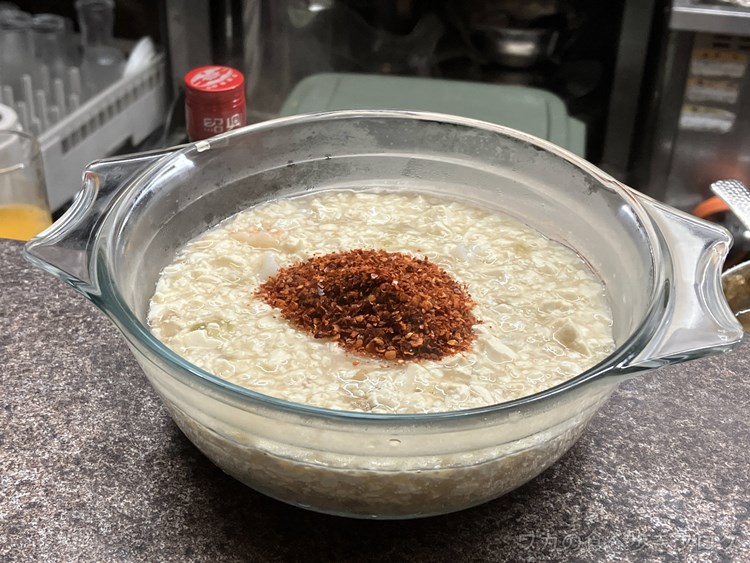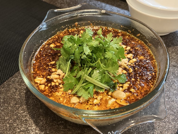 油を注いで、卓上でラー油を作る、そのままトッピングして・・・