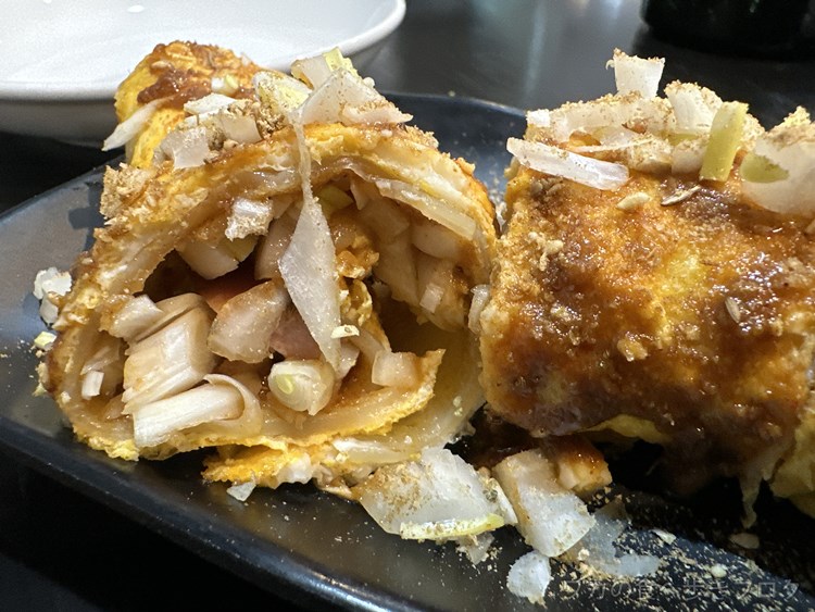モチッとした幅広い麺?に包まれた野菜と肉、ソーセージみたいな。