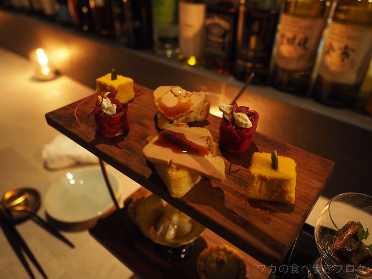 上段はかぼちゃのケーキに、ビーツの生春巻、フォアグラのテリーヌ