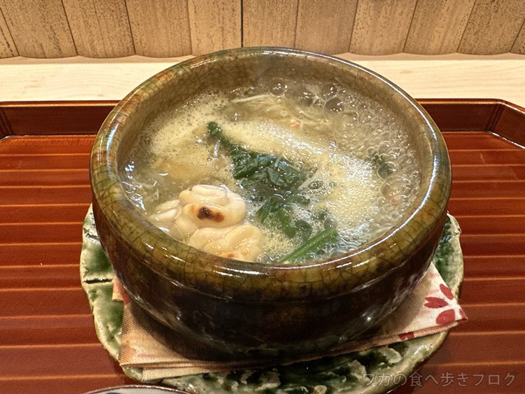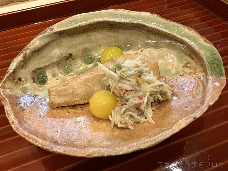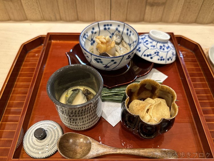 黒鮑の茶碗蒸し、くわいのチップス、牡蠣