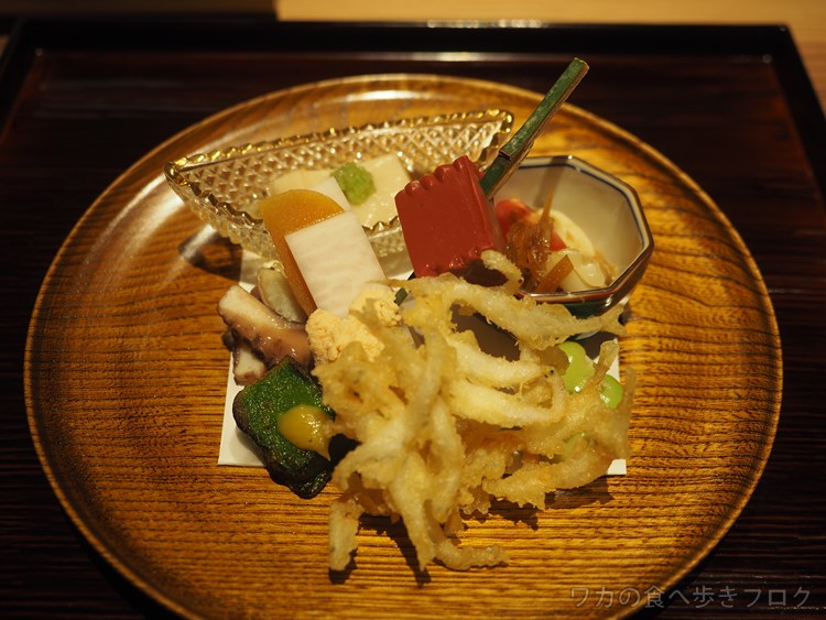 4.【八寸】 胡麻豆腐 つぶ貝 青竹打ち(赤蒟蒻 鯛の子 蓬麩)白魚 飯蛸 唐墨