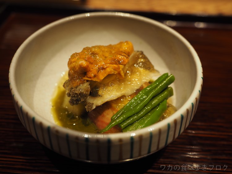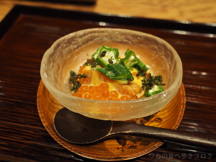 1.先付け サーモン炙り 長芋白煮 黄身酢かけ