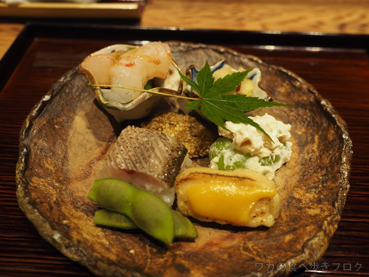 2.八寸 かます鮨、鱧南蛮漬け ボタン海老このわたがけ レンコン利休揚げ 栗麩田楽など