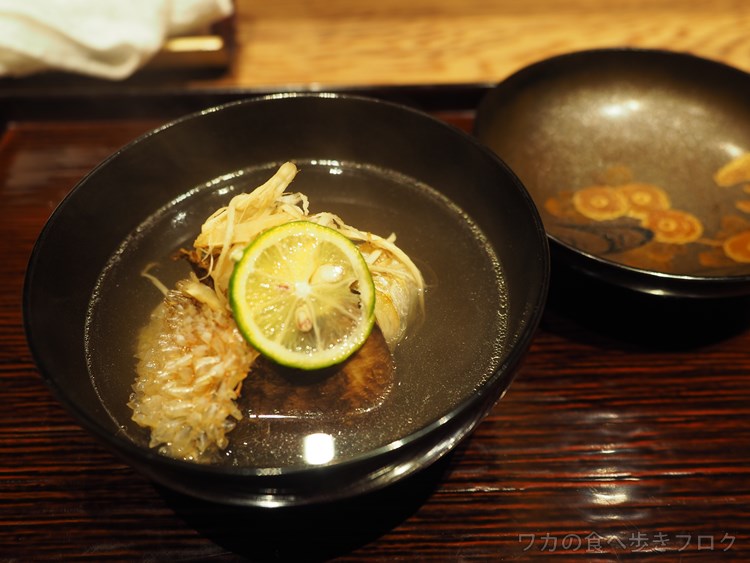 底には鮑の肝ソース。土佐酢のジュレが全体にかかってて