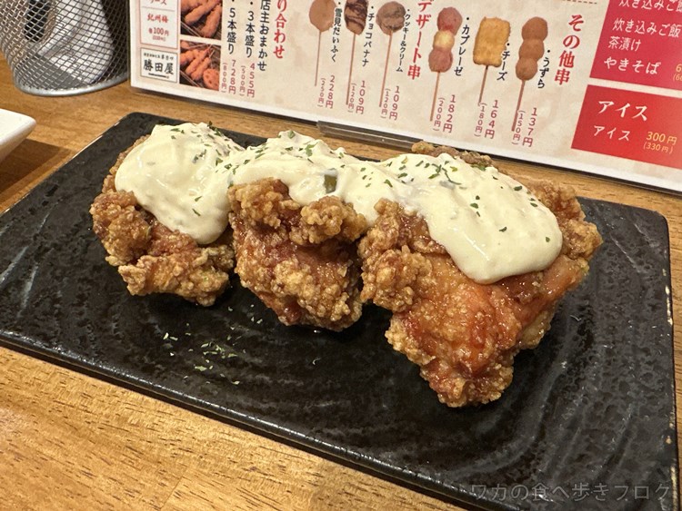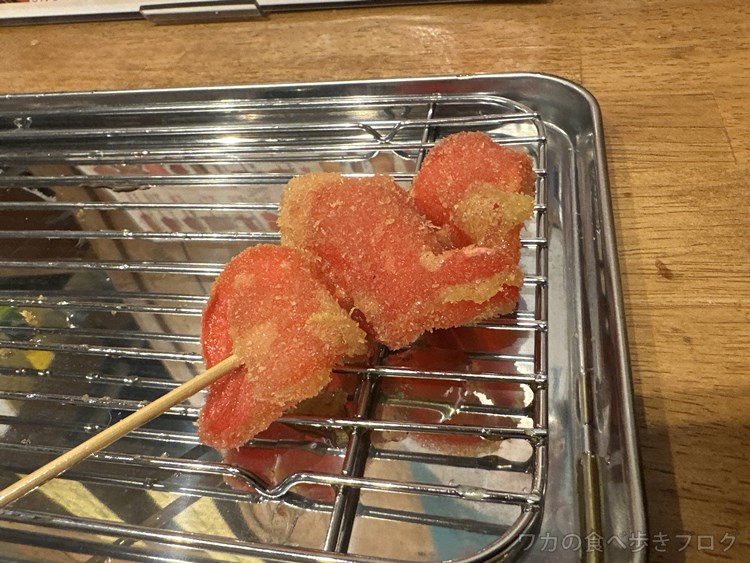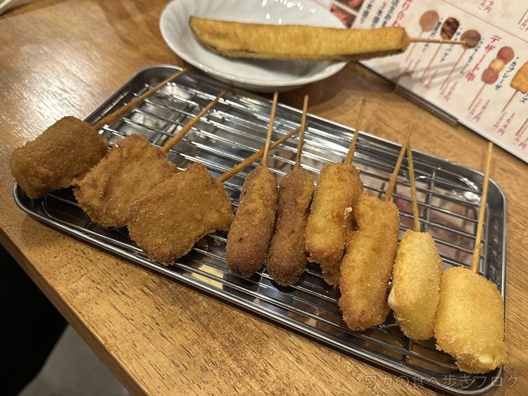 左から、豚串カツ、シャウエッセン、白身魚、チーズ、奥が茄子