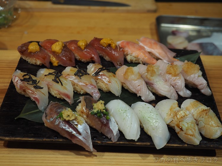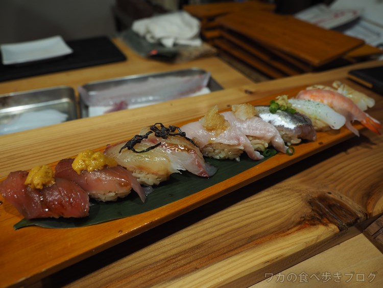 マグロウニ、白身に塩昆布、ブリ?おろしポン酢、アジ、イカ、海老生ハム