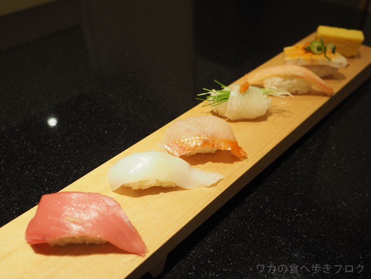 本マグロ中トロ、アオリイカ、金目鯛、ひらめ昆布〆芽ねぎ、ずわい蟹、あん肝、玉子