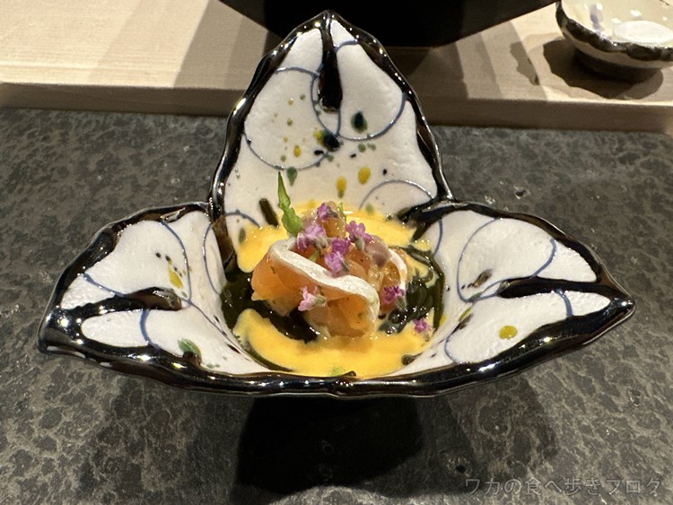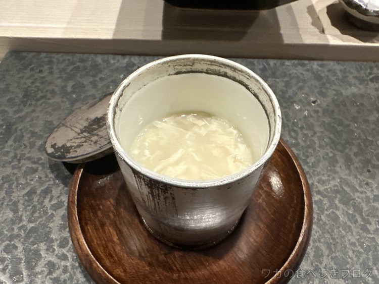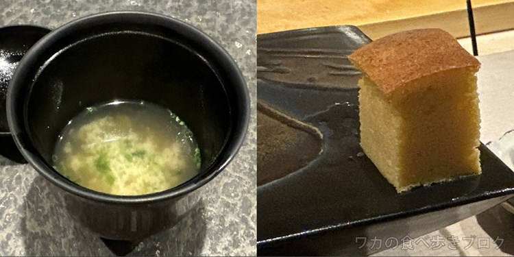 最後にシメの鬼海老の出汁の味噌汁とカステラ玉子
