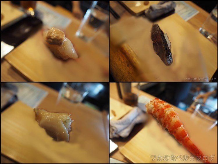 左上からカワハギ(肝乗せ)、シメサバ、ツブ貝に、車海老。