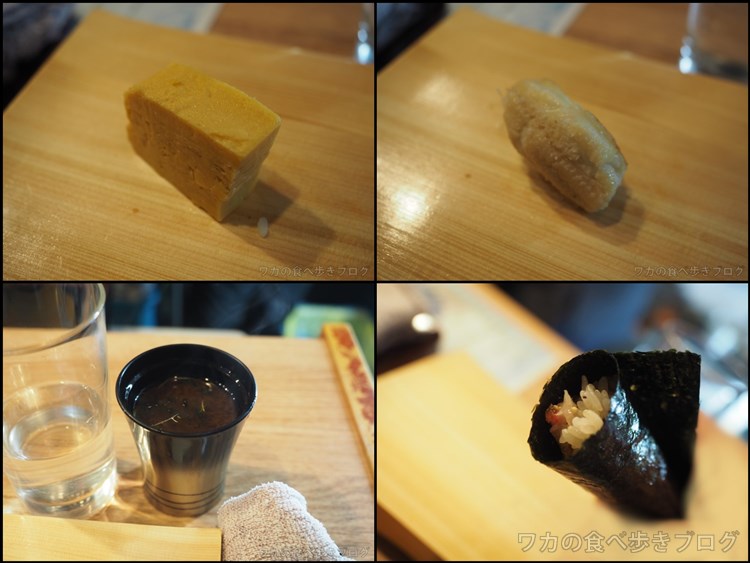 玉子焼きに、穴子、巻き寿司はトロたく。赤だしは湯のみで。