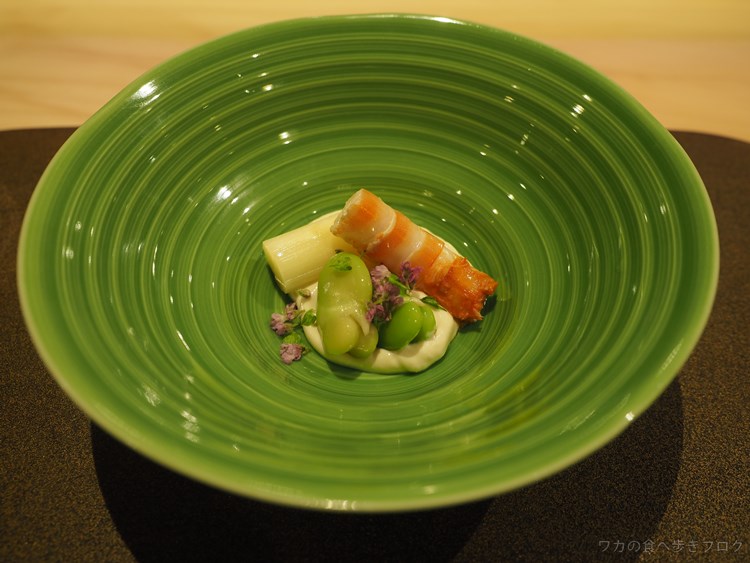 ホワイトアスパラ、一寸空豆、車海老の白和え