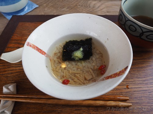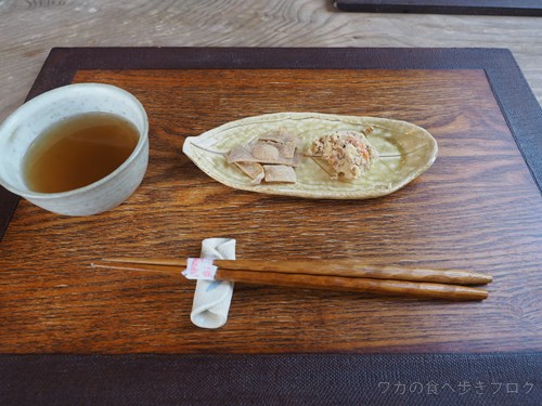 まず香ばしい蕎麦茶と蕎麦のスナックみたいなのと、おからが。。。