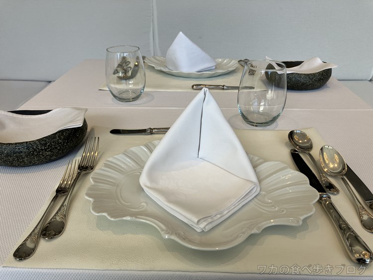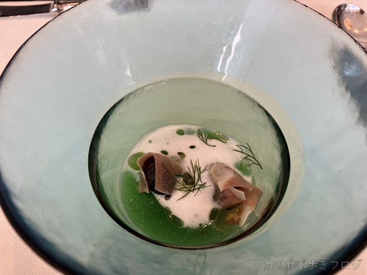 メロンのスープ、茄子の生ハム巻きが入ってる。