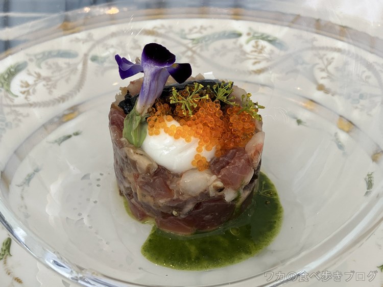 カツオと赤海老のタルタルに、とびこ、卵、イカ墨のムースがON