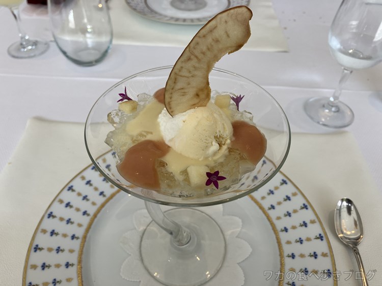 リンゴの皮のソースに果実のソースに、ソルベ、