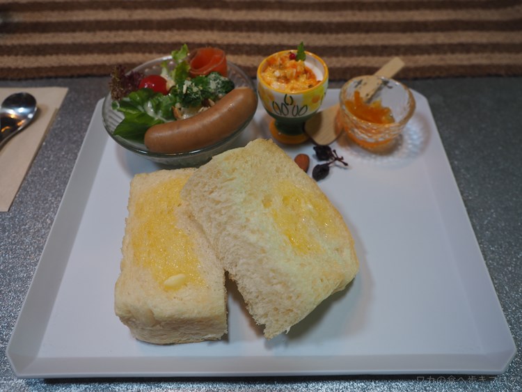 食事は厚切りトースト、サクッと小麦の味がしっかりしてて美味しい♪ 自家製かな?