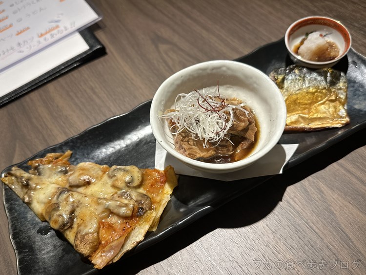 おばんざい3種盛り マッシュルームピザ、なんこつのトロトロ、塩さば