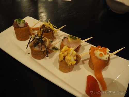 一口巻き寿司、いろんな味で串に刺さってる♪