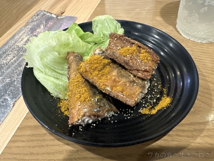 鯖の竜田揚げ、カレー風味・・・ お通し結構しっかりボリュームあるんやねw