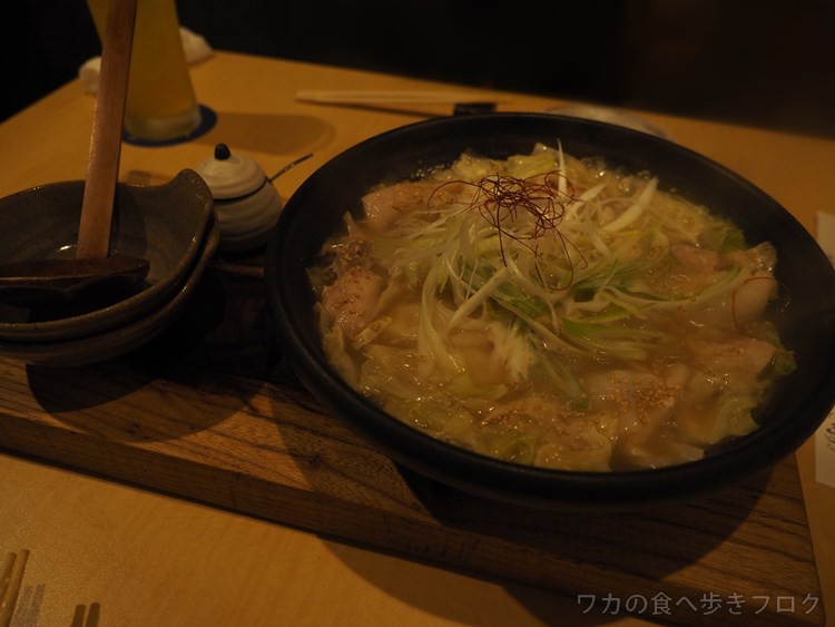 トッピングした鶏肉で野菜と餃子のあっさりした味にアクセントが