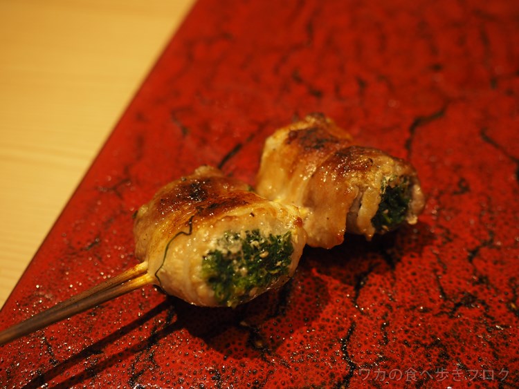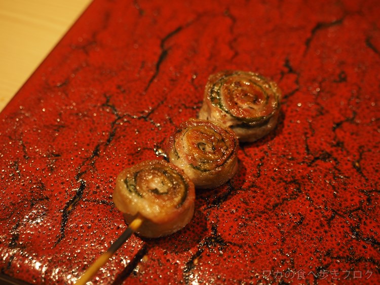 しそのナルト巻き串、豚肉がカリッと焼かれてしその香りが良いアクセント♪
