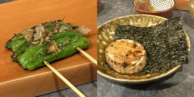 ししとうと、長いも、長いもは串から外して海苔で磯部巻きみたいに。
