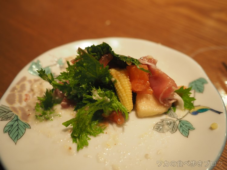 前菜:火入れ旬菜の生ハム巻き
