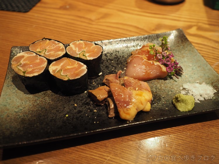 海苔巻きになってるのは霜降りにされてる鶏肉、