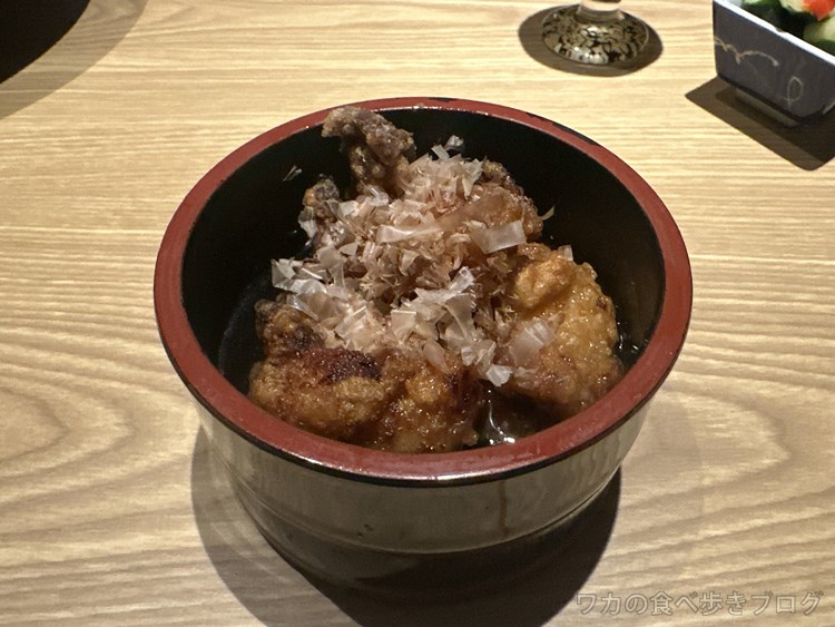 で、出汁に浮いてる唐揚げ、新しいw 上品な感じ、美味しいな~これはこれで(・∀・)