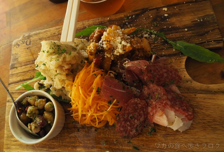 カポナータやサラミ、生ハム、ポテサラ、キャロットラペ、ミックスビーンズと