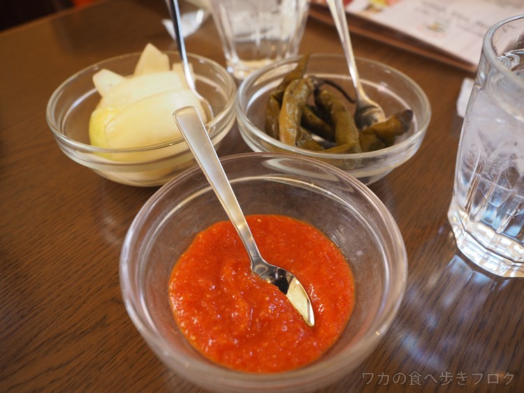 ハラペーニョソース、辛汁漬けな玉ねぎとか、唐辛子っぽいものの3種類
