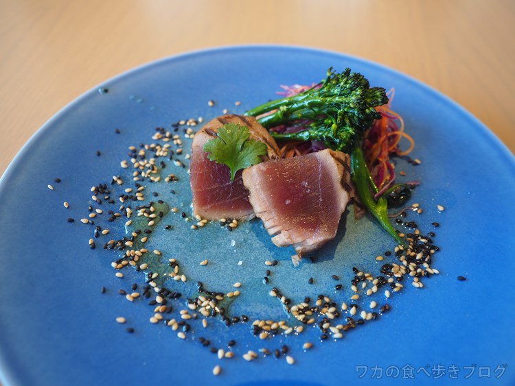 マグロステーキ 赤キャベツと胡麻醤油を添えて