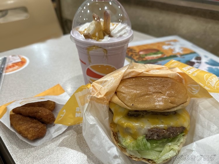 絶品ダブルチーズバーガー890円 と、チキンセット+紫芋ぱふぇシェーキ450円