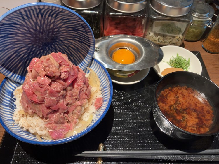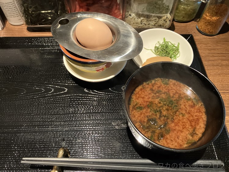 卵を乗っけて完成、後ろにある薬味も味変に使ってね、とのこと。