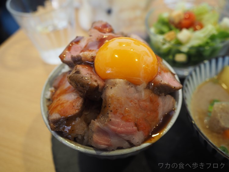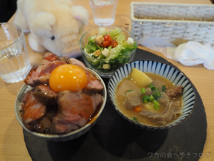 盛り盛りっと乗ったローストポークに卵、とん汁にサラダもセットです。